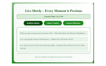 모든 순간은 소중하다는 Chrome 확장 프로그램은 100개의 인용구 모음을 통해 마음 챙김을 향상시키기 위해 설계되었습니다. 세 가지 범주로 구성된 이 확장 프로그램은 불교의 지혜, 문학적 통찰, 그리고 원래의 반성을 특징으로 하여 사용자에게 매일 반성하고 영적 성장의 기회를 제공합니다. 인용구는 사용자 친화적인 인터페이스에 표시되며, 차분한 녹색-흰색 그라데이션 테마와 부드러운 호버 효과로 매력적인 경험을 제공합니다.